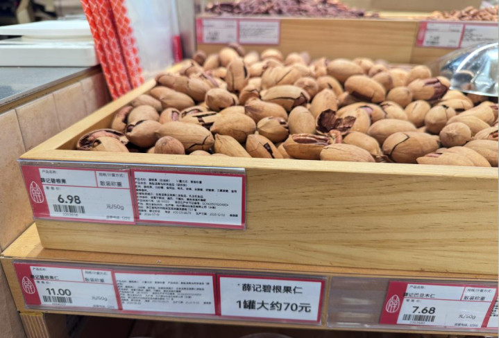 “臻选原材料、匠心烘焙技艺”……在商场里的炒货店,类似的标语往往伴随着颇具现代感的装修一同出现。与之对应的价签也显示着其定位:原味瓜子每斤18-25元,风味瓜子约28元上下;而开心果、碧根果等坚果及肉脯类,单价普遍在每斤80元以上,部分精品果仁超过百元。